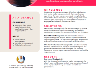 We helped this B2B Marine Services provider overcome the challenge of managing social media while running daily operations. By providing full-service social media management and developing a user-friendly, SEO-optimized website, we boosted their online visibility and lead generation. As a result, the company saw increased productivity, a surge in client inquiries, and ultimately, a doubling of their revenue.